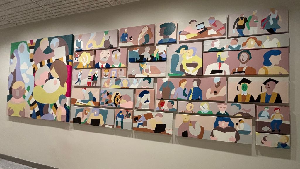 The stylized figures represent real students, professors, and administrators sourced from the university’s web and social presence. While not portraits, each figure is rooted in an actual member of the campus community. Their placement throughout the composition creates a visual presence of humanity—welcoming, observing, and reflecting back the energy of those who pass through this highly utilized building. In doing so, the figures remind viewers that a campus is built not just of stone and structure, but of the people whose choices fill those spaces with meaning.