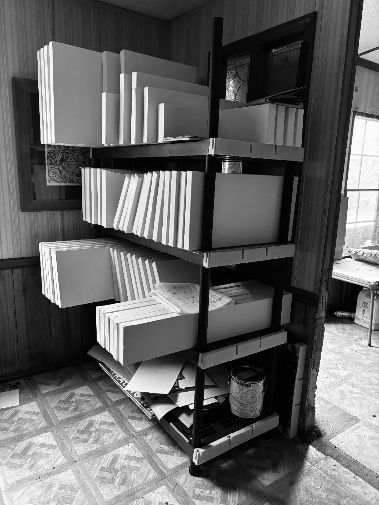 Nearly 70 paintings required serious organization. My dining room became a studio and storage hub, complete with modular shelving and extra easels. My talented friend Kathy Duke prepped each canvas with hardware, security brackets (per university request), and a pristine white base coat. I sketched, refined, and transferred each composition to canvas, while a meticulous numbering system kept every piece on track.