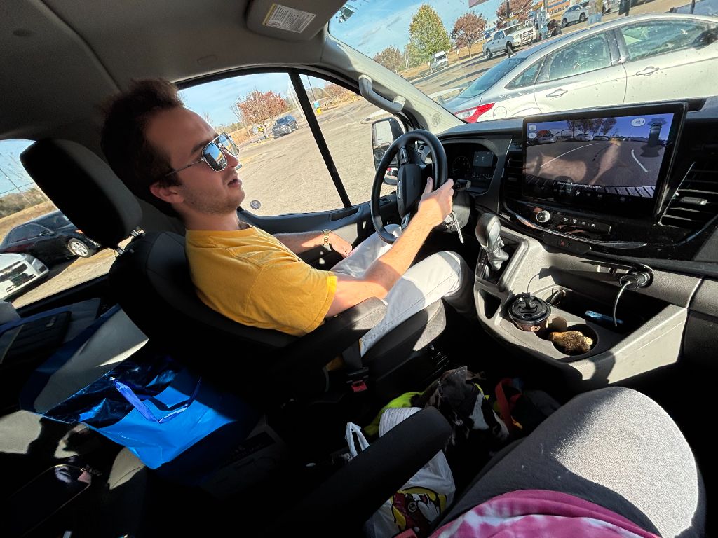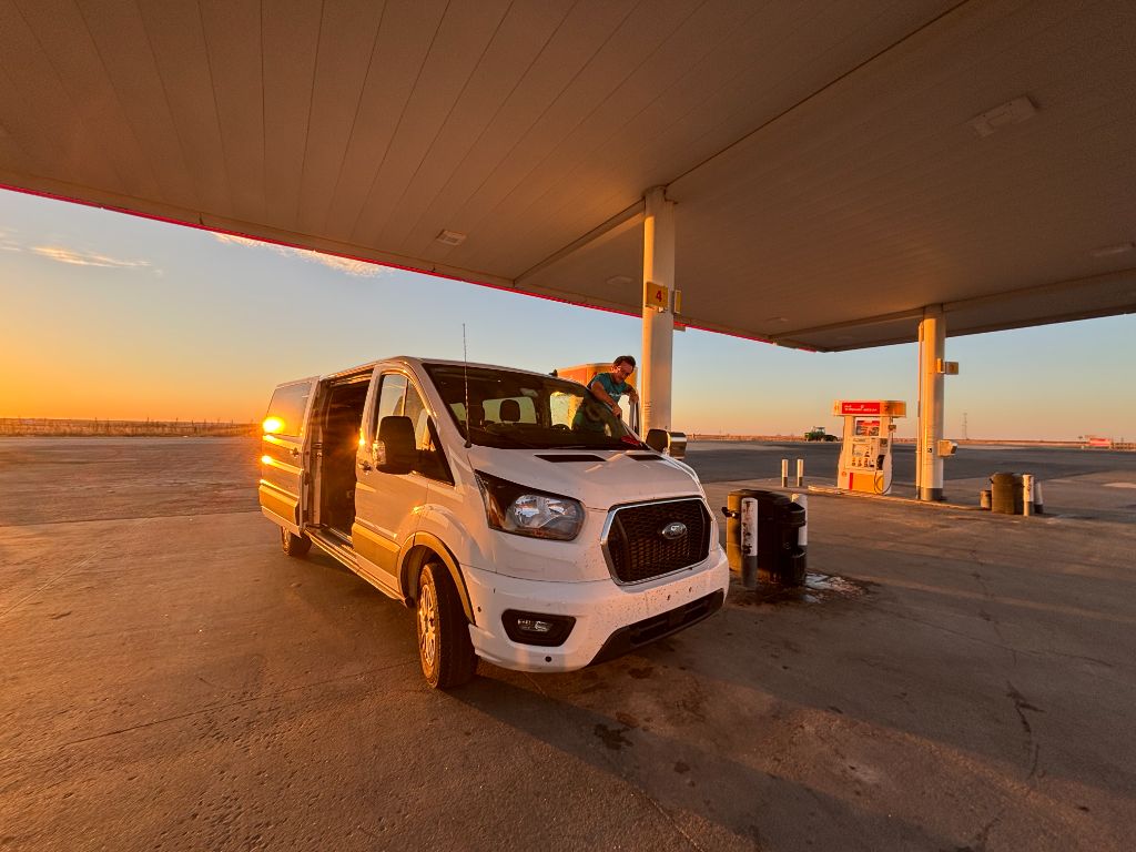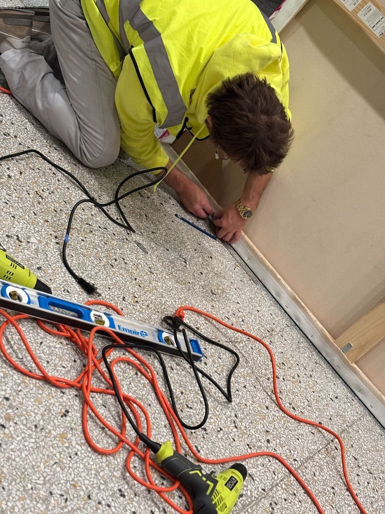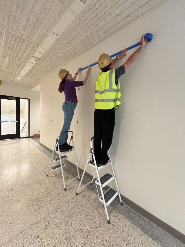 We rented a large transit van and drove west for 2½ days—an unforgettable journey across wide-open prairie skies. On site, we worked around active construction crews, fueled by daily Starbucks runs from the student union. Installation required careful measuring, drilling, leveling, and patience. Every painting had to align perfectly. It took a full week—and when the last piece went up, we paused to take it all in.