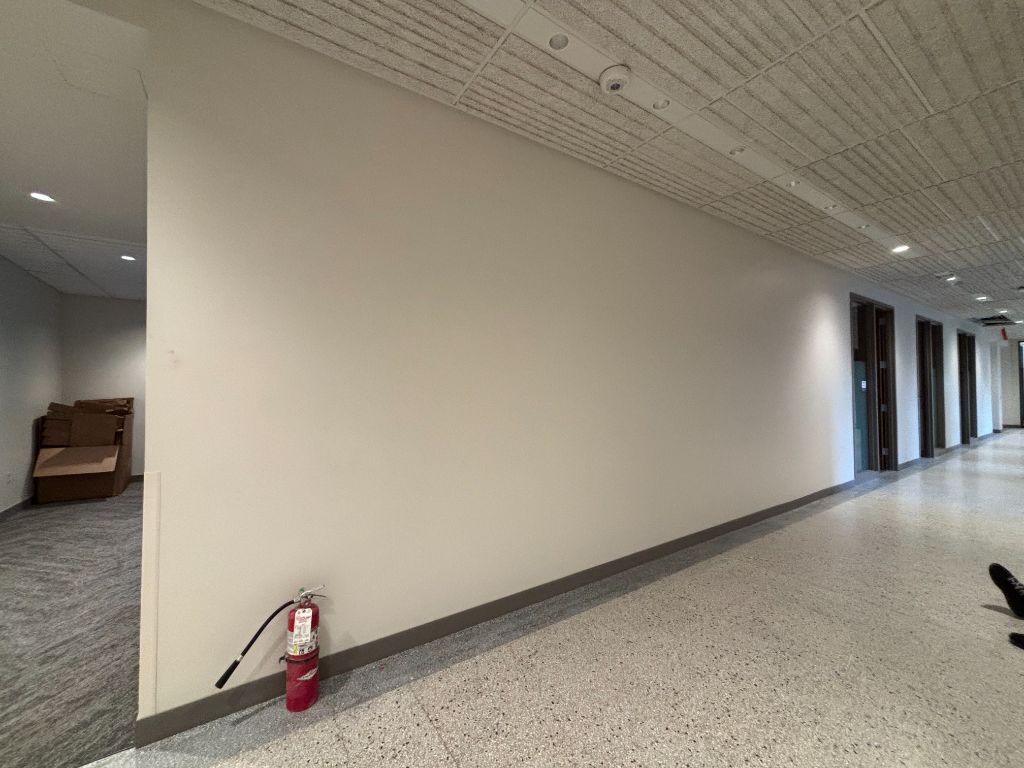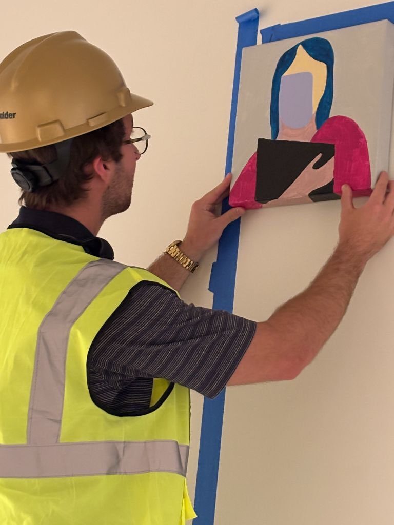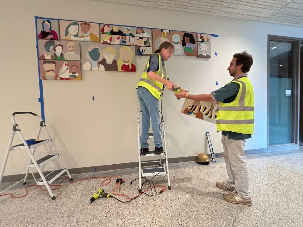 After submitting an online application, I was invited to present a concept to the project’s review board. Inspired by the building’s exterior stonework, I proposed a series of stylized portraits of current students, faculty, and administrators, anchored by a large “cornerstone” painting to express a central theme. The goal was to bring a warm, human presence to the space. Within a week, I was awarded the commission to create work for the two 20-foot central halls.