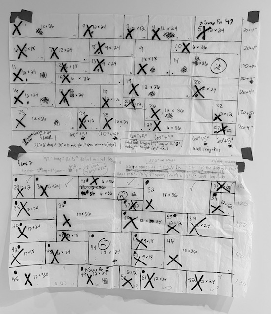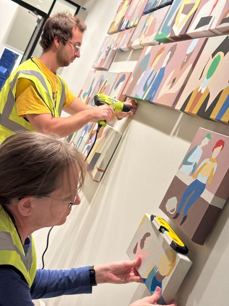 Months of planning followed—figuring out sizes, quantities, and spacing so dozens of individual paintings would read as a single, cohesive piece. I settled on a 3:1 ratio, with each collection measuring 16 x 5½ feet. Color selection took weeks: thanks to a summer sale, I expanded my palette to 26 colors, carefully chosen to echo the building’s stonework and unify the entire installation.
