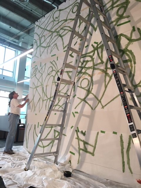 Finally it was time to mural. We loaded Kathy’s truck, filling the back with our ladders and supplies, and headed to Buckhead. The folks at Adrenaline had only moved into the space three days earlier. Their new office is at the Lindburg City Center. The space is stunning, to me like a cathedral. Our mural is located to the right of the entry in one of the two pass thru areas. On the opposite the reception area is a glass conference room with full view of the mural. Most visual elements within the office are black, white with a few red highlights, angular sharp linear design. The mural is the only organic visual in the space. Kathy and I set up our space, taped off the walls and floorboard and transferred the design to the dry wall. We even had time to start painting – salmon pink.