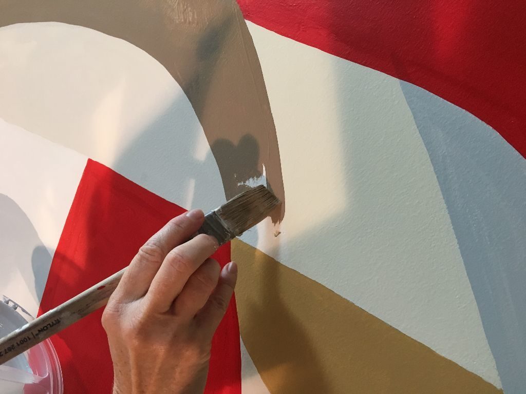 We were both really tired but hopeful we might finish today. Kathy focused on last highlight colors, the bold red and black. Both required two coats which slowed us. I worked on the principle colors of which there were many more and larger shapes. We worked hard all day, neither of us willing to confess we weren’t going to finish. I broke the ice just before 6, ‘Kathy…’ was all I got out when I heard a quiet ‘I know’. This day reminded me of the last time I moved. I looked around my apartment and thinking I didn’t have that much stuff and it shouldn’t take long to pack it up. Then I started opening drawers and cupboards and it took twice the time I thought. It’s the stuff you don’t see or realize until its in your face that always slows you down. As the mural neared completion, we had to work slower and slower to maintain the overall design integrity. I never anticipated this because it isn’t what I experience painting smaller gouache pieces or with working with and guiding someone else to align with your vision. Today we broke out the micro brushes to paint the very small, tight intersection points between multiple colors.