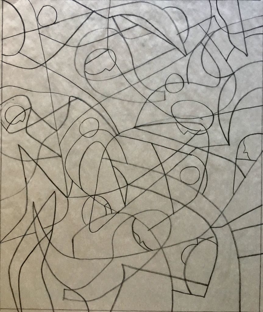 I worked through a series of rough doodles the only direction Matt offered ‘it could be a little more abstract’. Music to my ears! We settled on a composition then quick approval on a finished line drawing and we were ready to work onsight.